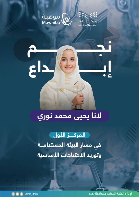 لانا يحيى نوري نجمة ساطعة في سماء التميز بجد وبذل وهمة عالية هاهي تصعد من جديد لتتلألأ في إبداع 2026بحصد المركز الأول في الجوائز الكبرى وحصولها على لقب نجمة إبداع 2026 بارك الله لها ولوالديها وحفظها بحفظه.